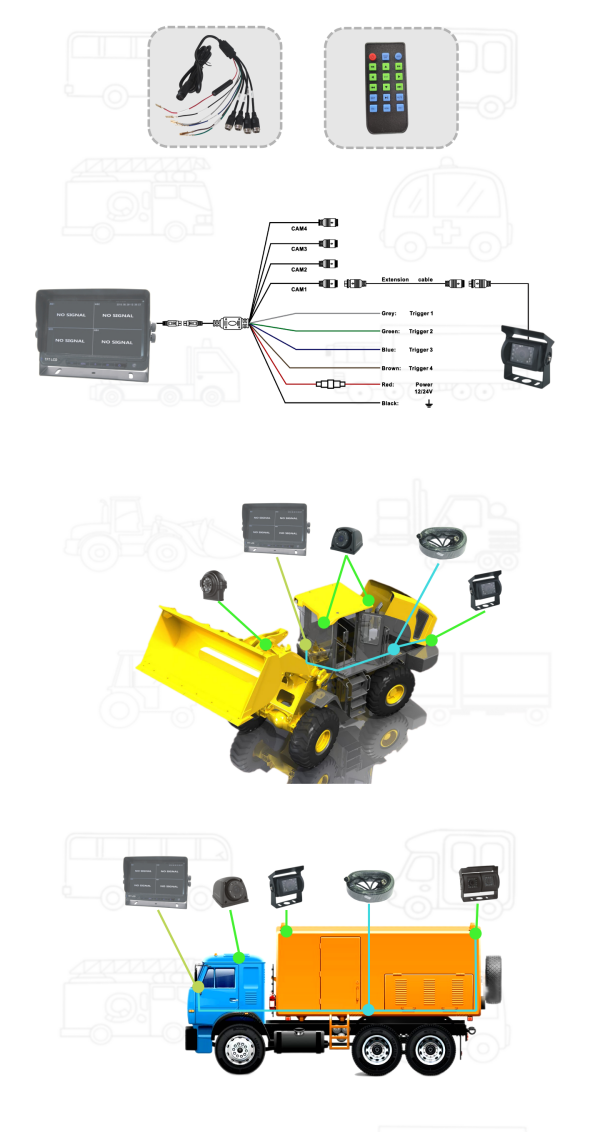 Caratteristiche :AV, fotografia, funzione di registrazione video (il file di registrazione memorizzato nella scheda SD, memoria massima di 128G, che supporta la registrazione continua per 24 ore):AV2/AV3/AV4 con filo di attivazione, una volta attivato il filo di attivazione, l’immagine passa automaticamente alla macchina fotografica corrispondente e scatta foto.