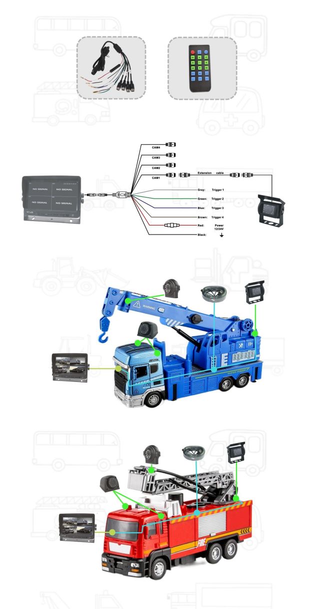 Caratteristiche :AV, fotografia, funzione di registrazione video (il file di registrazione memorizzato nella scheda SD, memoria massima di 128G, che supporta la registrazione continua per 24 ore):AV2/AV3/AV4 con filo di attivazione, una volta attivato il filo di attivazione, l’immagine passa automaticamente alla macchina fotografica corrispondente e scatta foto.