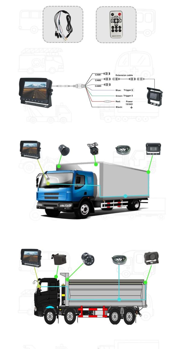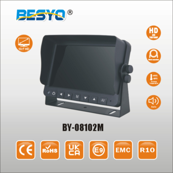 Monitor HD 10.1 pollici: Rapporto d’aspetto: immagine 16:9 Risoluzione 1024(H)*R.G.B*600(V) Video 2/3/4,1 audio opzionale Alimentazione elettrica :DC 12/24V Sistema: auto-commutazione PAL&NTSC Menu OSD, telecomando Display multi-lingue Regola automaticamente il sensore di luce Adatto alla telecamera a vista posteriore