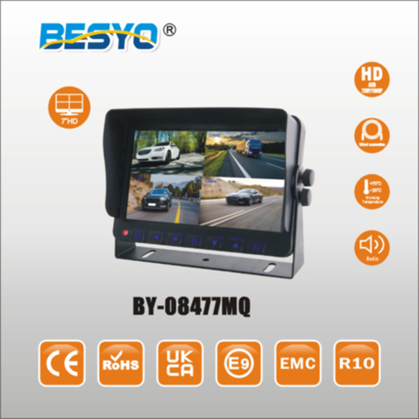 Monitor split da 7 pollici HD 4QUAD: Rapporto d’aspetto: immagine 16:9 Risoluzione 800(H)*R.G.B*480(V) 4 video, 1 audio opzionale Alimentazione elettrica: DC 12/24V Sistema: auto-commutazione PAL&NTSC Menu OSD, telecomando Display multi-lingue Regola automaticamente il sensore di luce Adatto alla telecamera a vista posteriore