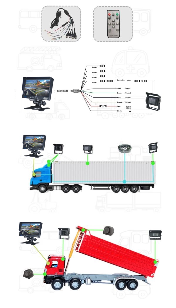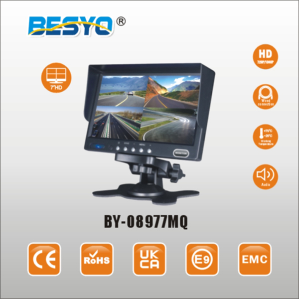 Monitor diviso da 4QUAD da 7 pollici: Rapporto d’aspetto: immagine 16:9 Risoluzione 800(H)*R.G.B*480(V) 4 video, 1 audio opzionale Alimentazione elettrica: DC 12/24V Sistema: auto-commutazione PAL&NTSC Menu OSD, telecomando Display multi-lingue Regola automaticamente il sensore di luce Adatto alla telecamera a vista posteriore