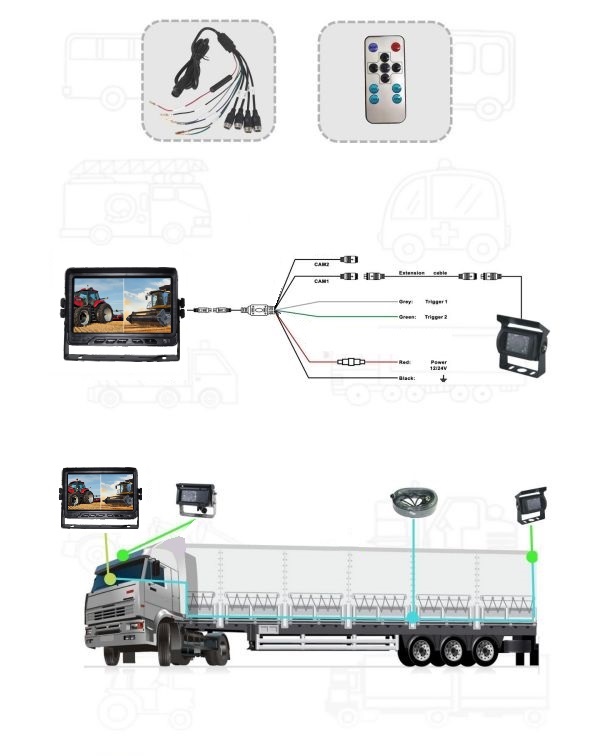 Monitor a due vie ad alta definizione da 7" con separazione: Proporzione: 16:9 Immagini Risoluzione: 800(H)*R.G.B*480(V) 2 video, 1 audio selezionabile Alimentazione elettrica: DC 12/24V Sistema: commutazione automatica di PAL e NTSC Menu OSD, telecomando Mostra multilingue Regolazione automatica del sensore di luce Adatto per telecamere posteriori